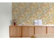 Okrové vliesové tapety na zeď, motivy listů v odstínech tyrkysové, šedé, hnědé a béžové. Látkové textura.