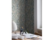Tmavě modrá vliesové tapety na zeď, květiny a motýli v odstínech zelené, růžové, šedé a hnědé.