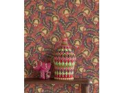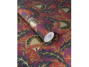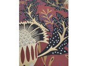 Vínové vliesové tapety na zeď, netradiční květinové vzor inspirovaný africkou batikou, zlaté květy a části listů, další barvy- modrá, černá, hnědá. Co vás zaujme: vyrobeno s ohledem na udržitelnost a ekologii. Design: přírodní, etno. Úroveň tapetovéní: za