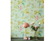 Vliesové tapety s hladkou texturou. Podklad světle zelený, design s ptáky, palmami, listy a exotickými květinami.