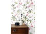 Vliesové tapety bílá, s růžovémi plameňáky a palmami.