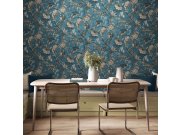 Vliesové tapety na zed, motiv exotických ptáků mezi květinami a větvičkami stromů, pololesklý modrý podklad, hnědo-béžové a černý vzor, vláknitá textura. Co vás zaujme: vyrobeno s ohledem na udržitelnost a ekologii. Design: nadčasové, přírodní. Úroveň tap