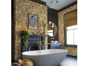 Vliesové tapety na zed, motiv exotických ptáků mezi květinami a větvičkami stromů, pololesklý okrové podklad, hnědo-šedo-stříbrný vzor, vláknitá textura. Co vás zaujme: vyrobeno s ohledem na udržitelnost a ekologii. Design: nadčasové, přírodní. Úroveň tap