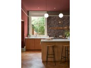 Pololesklá hořčicové vliesové tapety na zeď, květiny a listy v odstínech černé, červené a zlato-béžové.