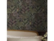 Vliesové tapety na zeď, design inspirovaný výšivkami, černý podklad, vzor v odstínech zelené, švestkové, oranžové a žluté. Co vás zaujme: vyrobeno s ohledem na udržitelnost a ekologii. Design: přírodní. Úroveň tapetovéní: pro začátečníky. Země původu: Ve