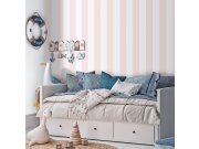 Vliesové tapety na zeď, růžovo-bílé pruhy, textura velmi jemné látky. Pruhy 13,5 cm. Co vás zaujme: zdravotně nezávadné materiály vhodné do dětských pokojů. Design: dětský, grafický. Úroveň tapetovéní: pro začátečníky. Země původu: Španělsko.