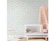 Hladká bílá vliesové tapety na zeď, květinové vzor v odstínech zelené a růžové.