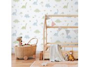 Vliesové tapety na zeď, dětské motivy dinosaurů v odstínech modré, zelené a okrové, textura velmi jemné látky. Co vás zaujme: zdravotně nezávadné materiály vhodné do dětských pokojů. Design: dětský. Úroveň tapetovéní: pro začátečníky. Země původu: Španěls