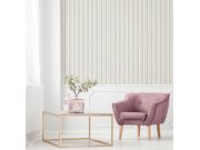 Bílá vliesové tapety na zeď, pruhy v odstínech šedé a béžové. Pruhy cca 8 cm. Co vás zaujme: hodí se do všech typů místností. Design: nadčasové, klasický. Úroveň tapetovéní: pro začátečníky. Země původu: Španělsko.