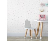 Papírové tapety bílá s jemnou látkovou texturou, růžové a béžové hvězdičky.
