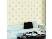 Luxusní vinylové tapety se zlatým zámeckým, vzorem, okrovo-zlatý podklad má vzhled a texturu jemné textilie.