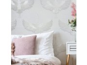 Vliesové tapety s vinylovém povrchem, bílá / slonové kost, motiv letících volavek, podklad hrubší textilní struktura, vzor evokuje pololesklou výšivku. Co vás zaujme: efektní vzor, vysoká odolnost a omyvatelnost. Design: přírodní. Úroveň tapetovéní: pro z
