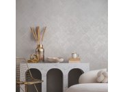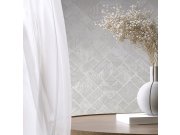 Luxusní bílá vliesové tapety s plastickým stříbrným geometrickým vzorem na podkladě imitující štukovou omítku. Foto interiéru je pouze ilustrační - odlišné barvy.