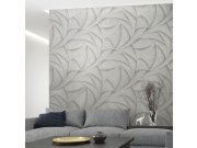 Pololesklá šedo-stříbrná jemně plastické vliesové tapety s vinylovém povrchem, geometrický vzor, místy stříbrné třpytky. V reálu světlejší, doporučujeme vyžádat si vzorek. Foto interiéru je pouze ilustrační - odlišné barvy.