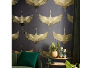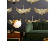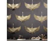 Vliesové tapety s vinylovém povrchem, podklad hrubší černá textilní struktura, hnědo-zlatý motiv letících volavek vzor evokuje výšivku. Co vás zaujme: efektní vzor, vysoká odolnost a omyvatelnost. Design: přírodní, luxusní. Úroveň tapetovéní: pro začátečn