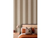 Vliesové tapety s vinylovém povrchem, pruhy v odstínech hnědé a hnědo-šedé, látkové textura. Pruhy cca 13 a 13,5 cm. Co vás zaujme: vysoká odolnost a omyvatelnost, kvalita zpracovéní. Design: nadčasové, klasický. Úroveň tapetovéní: pro začátečníky. Země p