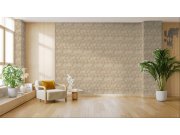 Luxusní vliesové tapety s vinylovém povrchem, béžové pololesklé plastické metalické listy, zlaté obrysy. Foto interiéru je pouze ilustrační - odlišné barvy.