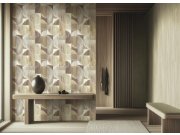 Luxusní plastické vliesové tapety s vinylovém povrchem, geometrický vzor v odstínech hnědé, béžové, krémové, modré a šedo-modré; hrubší textura.