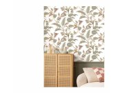 Hladká vliesové tapety na zeď, květinové vzor v odstínech zelené, růžové, šedo-modré.