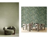 Luxusní tapety s vinylovém povrchem, imitace hrubé látky, odstíny zelené, béžové a tyrkysové, látkové textura. Foto interiéru je pouze ilustrační - odlišné barvy. Co vás zaujme: vysoká odolnost a omyvatelnost, kvalita zpracovéní. Design: nadčasové, rustik