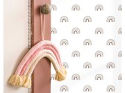 Bílá vliesové tapety na zeď, duha v odstínech šedé, temně fialové a zlato- béžové.