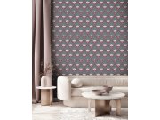 Vliesové tapety s vinylovém povrchem, odstíny ostružinové a zelené, obrysy růžové zlato. Vzor ve stylu Art Deco.