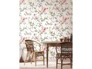 Vliesové květinové tapety na zeď, rozkvetlé větvičky v odstínech zelené, červené a lososové, bílý podklad.