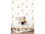 Hladká vliesové tapety na zeď, bílý podklad, hnědo-béžové žirafky o výšce 10,5 cm, zelené a šedé rostlinky. Co vás zaujme: zdravotně nezávadné materiály vhodné do dětských pokojů. Design: přírodní, dětský. Úroveň tapetovéní: pro začátečníky. Země původu: