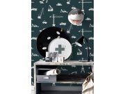 Vliesové tapety pro kluky - auta, jeřáby, vrtulníky, tmavě modrý podklad, bílý vzor.