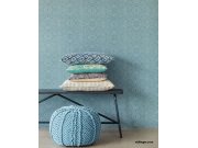 Tmavě modré ornamentální vzory na modré vliesové tapetě s jemnou látkovou strukturou.