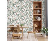 Bílá vliesové tapety s vinylovém povrchem, květinové vzor v odstínech zelené a růžové.