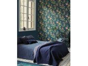 Vlisové tapety s jemně plastickou texturou. Velké květiny, rostliny a ptáci. Podklad je v tmavě modré barvě, s drobným vzorkem "sluníček".