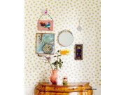 Puntík vnese do vašeho interieru nové rozměr a originalitu. Okrové jemně plastické puntíky se zlatými třpytkami na bílém podkladu.
