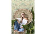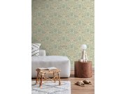 Vliesové tapety na zeď, motivy květin, rostlin a ptáčků v odstínech zelené, šedé a béžové.