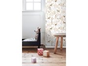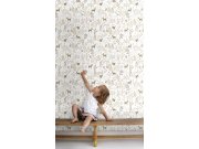 Hladká bílá vliesové tapety na zeď, dětské vzory přírody a zvířátek v odstínech hnědé, béžové a šedé.