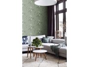 Vliesové květinové tapety na zeď, rozkvetlé větvičky v odstínech zelené, bílé a růžové, šedý podklad.
