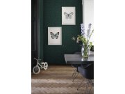 Tmavě zelená vliesové tapety na zeď, motivy květin a pávů, textilní struktura.