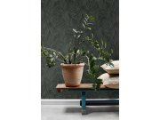 Luxusní pololesklá tmavě zelená vliesové tapety s vinylovém povrchem, plastické motivy palmovéch listů, odstíny šedo-černé a zlaté.