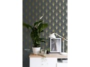 Vliesové, tmavě tyrkysové tapety s geometrickým vzorem, linie zlaté.