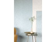 Tyrkysové vliesové tapety na zeď, geometrický vzor, efekt matu a metalického pololesku.