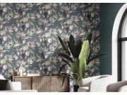 Luxusní tyrkysové vliesové tapety s vinylovém povrchem, motivy listů, odstíny vínové, béžové a pískové, látkové textura.