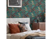 Tyrkysové vliesové tapety na zeď, listy v odstínech zelené, béžové, cihlové a vínové, látkové textura.