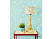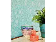 Hladká tyrkysové vliesové tapety na zeď, motivy květin v odstínech bílé, šedé a fialové.