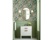 Tyrkysové vliesové tapety na zeď, květiny a motýli v odstínech zelené, hnědé, červené, růžové a béžové.