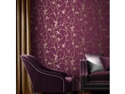 Vínové, jemně strukturovaná, vliesové tapety na zeď, větvičky a listy v odstínech fialové, lila a hnědé.