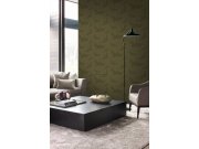 Hladká šedo-zelená vliesové tapety na zeď, rozkvetlé větvičky a ptáčci, místy jemné pololesklé stříbřité detaily.