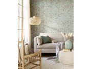 Pololesklá zelená vliesové tapety s květinovém vzorem na jemně žíhaném podkladu.