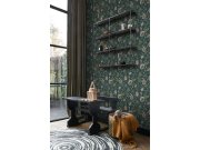 Temně zelená vliesové tapety s květinovém vzorem v odstínech zelené, béžové a starorůžové.