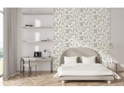 Omyvatelné vliesové tapety s vinylovém povrchem, motivy listů, větviček, světle zelené a krémové s perlovém pololeskem.