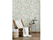 Zelená vliesové tapety na zeď, motivy květin v odstínech zelené, růžové a okrové.